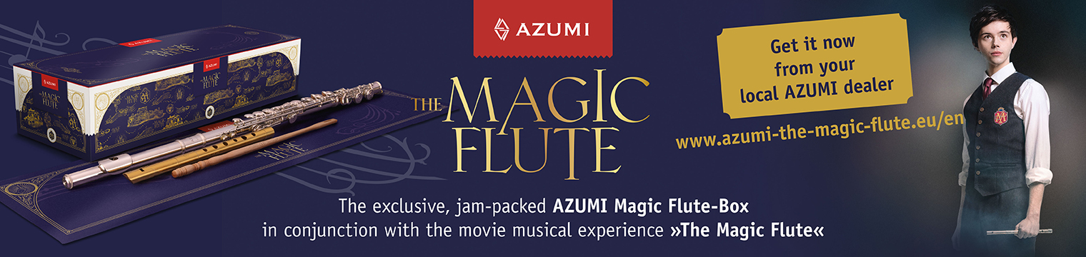 AZUMI is offering in conjunction with the box office movie "The Magic Flute" a unique and exclusive Box-set, with an AZUMI flute from the popular Z2-series, with a handmade Sterling silver headoint made by ALTUS, and the "The Magic Flute" Tin Whistle, the same whistle as used in the movie. And lots of more interesting additions in the box, like a velvet cloth for a safe situation on the table and the branded and engraved cleaning rod.