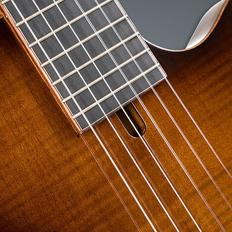 Das Herzstück der Sunset Nylectric DLX ist eine massive Fichtendecke, die mit einem geflammten Ahornfurnier veredelt wurde. Diese Kombination verleiht der Gitarre nicht nur eine außergewöhnliche Optik, sondern sorgt auch für exzellente Schwingungseigenschaften, die einen warmen und ausdrucksstarken Klang garantieren.