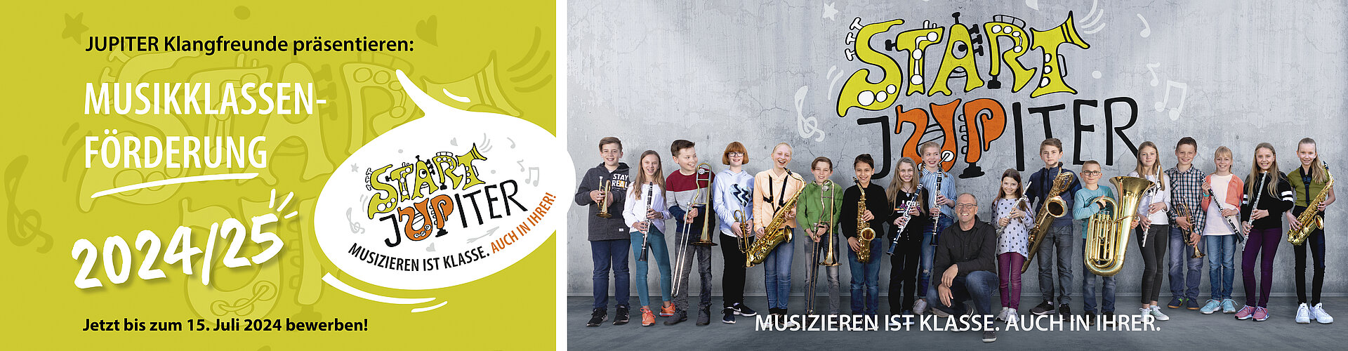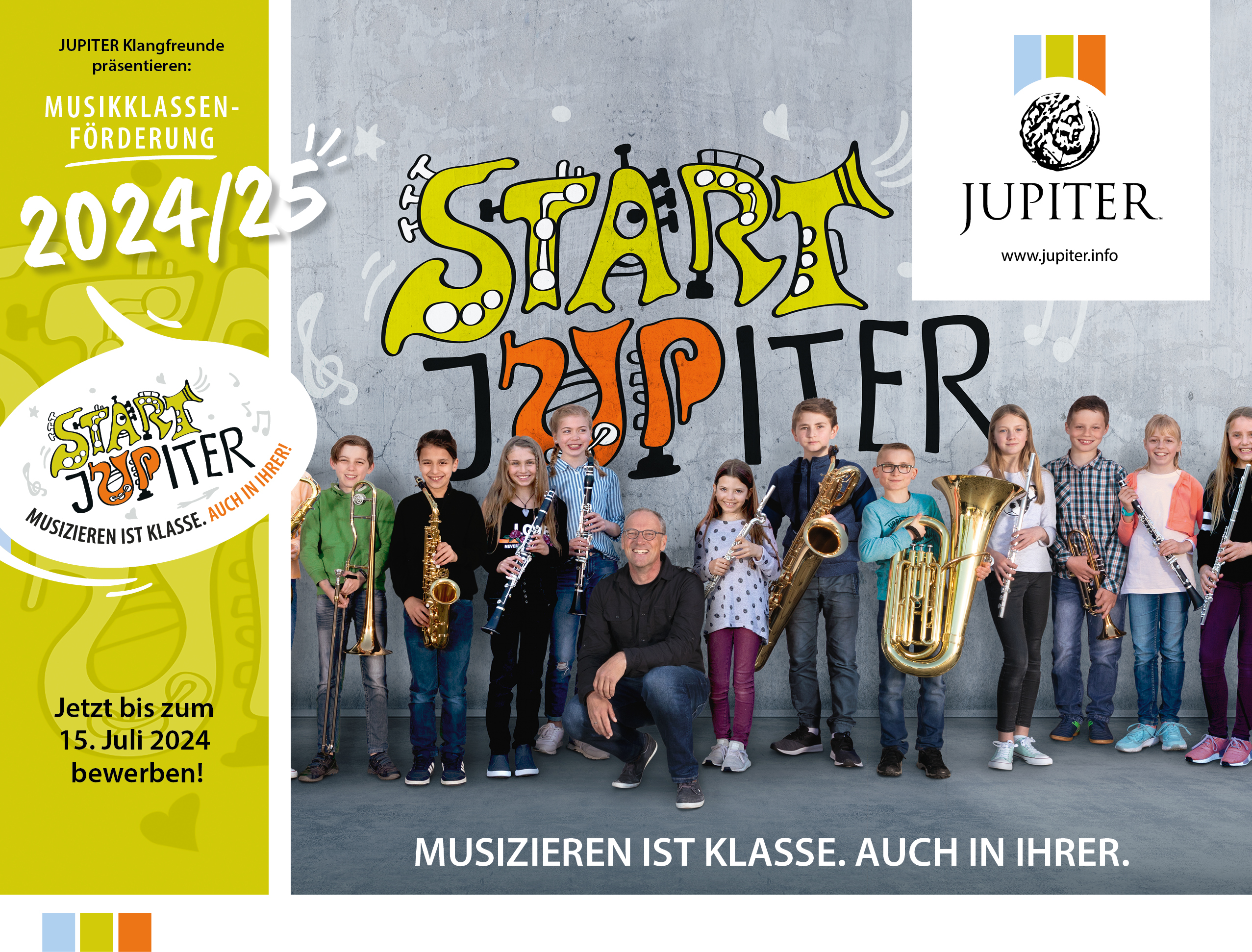Nach dem Erfolg der letzten Jahre folgt die Fortführung. Der Blasinstrumentenhersteller JUPITER fördert wiederholt den Aufbau von 20 neuen Musikklassen an allgemeinbildenden Schulen für das Schuljahr 2024/2025. Mit Rat, Tat und einer umfangreichen Instrumentenausstattung bietet JUPITER eine risikolose und unkomplizierte Starthilfe zur Gründung einer neuen Musikklasse an.